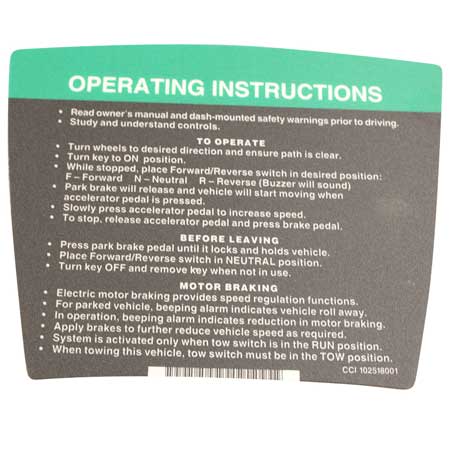 Product Description Specifications Mfg. Part Number 102884301 - DECAL- INSTR- OPERATING Manufacturer: Club Car
